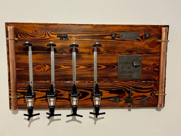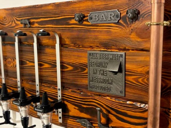 Bespoke burnt wood bar optic with cast iron, copper and brass hardware w 800. H 450. D 45
