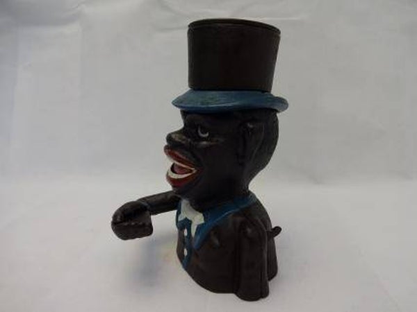 This cast iron Americana "Jolly Boy" bank is a reproduction from the 1930's era. The moneybox comes with a lever-operated articulated mechanical arm which transfers the coin to the figure's mouth. Wearing a hat, this figure is handpainted in an vintage scuffed style, with "Jolly Boy Bank" appearing on the rear.