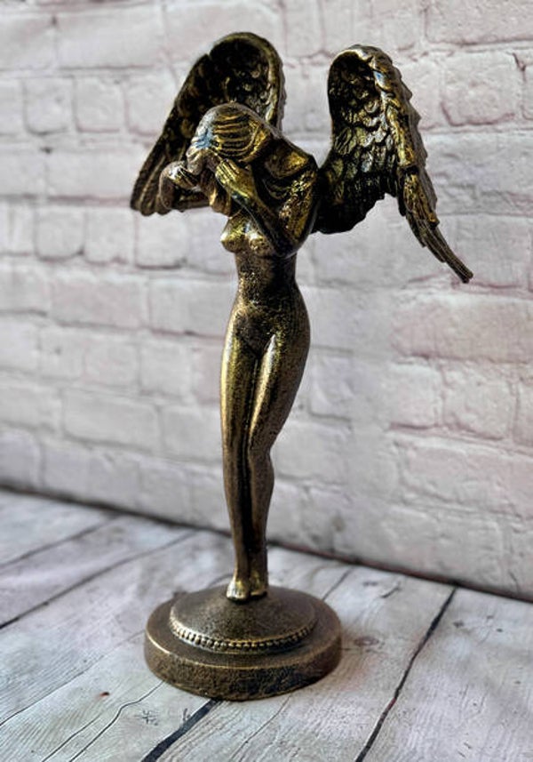 This beautiful ornament depicts a graceful angel with magnificent, outstretched wings. Posed in a classic, artistic style, the figure evokes themes of harmony and the divine. Crafted from solid cast iron, this statue has a satisfying weight and a premium feel. It is finished in a stunning antique bronze effect over a unique, textured surface that catches the light and highlights the elegant contours of the sculpture.
