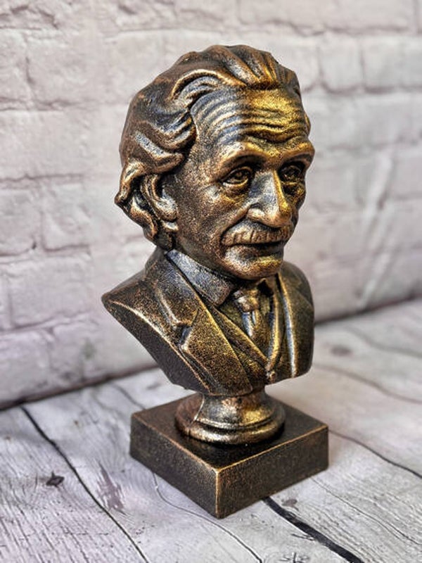 This is a stunning cast iron bust featuring the head of Albert Einstein, the world-renowned theoretical physicist and one of the most influential scientists of all time. Born in Germany in 1879, Einstein developed the theory of relativity, a cornerstone of modern physics. His mass-energy equivalence formula, E=mc² has been dubbed "the world's most famous equation." For his work, he received the 1921 Nobel Prize in Physics, and his name has become synonymous with genius.