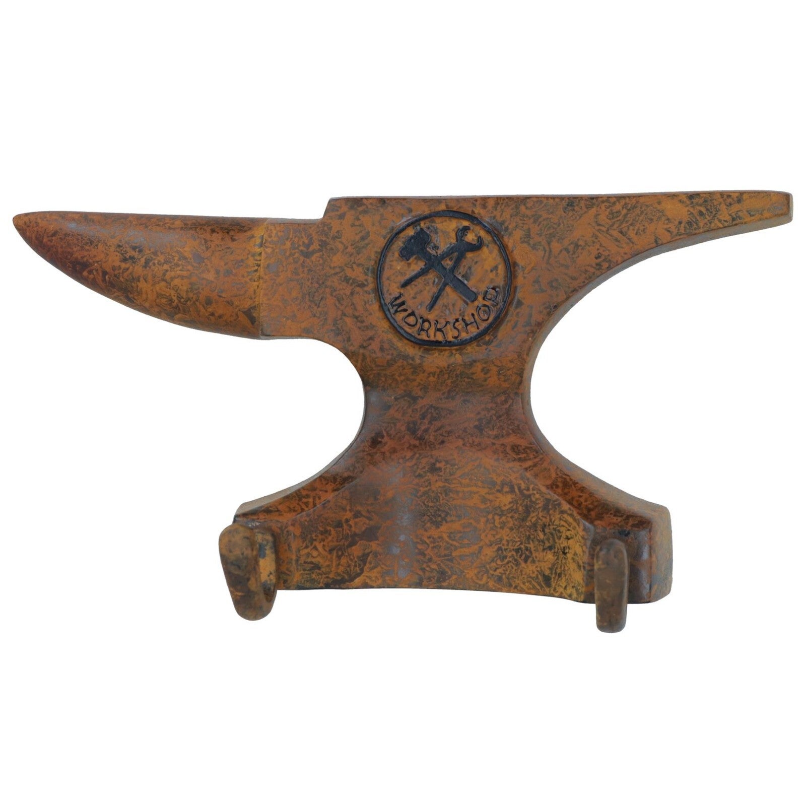 This decorative cast iron wall rack is shaped like a traditional blacksmith's anvil, finished in a rustic antique brown to mimic the look of weathered metal.