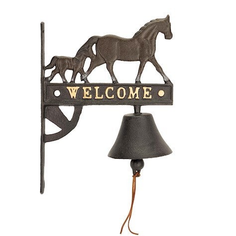 Here is a charming cast iron wall-mounted bell with a mare and foal decoration. The bell is handpainted in a vintage-style black and gold colour scheme, with the horse and foal motif sitting atop finished in dark brown. Underneath, the word "Welcome" is finished in raised gold lettering. This is a lovely item, especially suitable for country houses and rural outbuildings, and provides a welcoming and homely greeting to visitors.